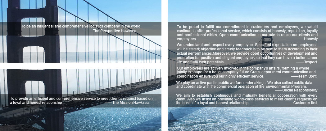 Hawksea International Logistics Co., Ltd. was founded in 2007. We are specialized in the third party logistics service, with the strategic goal to become “globalized supply chain Pipe Company”, and we have been working to promote the rapid and all-round development of the logistics service industry in China over the years. Supported by our advanced IT system, we fully integrated group and social logistics resources, provide customers a full range of logistics and value added service.